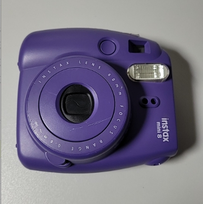 富士拍立得mini8,紫色,成色有明显使用痕迹。功能完好,无需维修。电池仓盖卡扣断,自带60mm焦距镜头,适合即时成像。